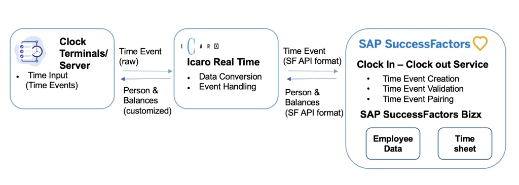 ICARO Real-Time setzt auf das, beim Kunden schon vorhandene , hardwaregestützte Zeiterfassungssystemumgebung mit Terminals und ggf. Ausweisverwaltungsprogramme etc. um die Daten von Zeiterfassungsvorgängen zu empfangen .Diese Lösung ist speziell für Unternehmen entwickelt, die auf zuverlässige und robuste Erfassungssysteme setzen und zusätzlich, bzw. neu, die Funktionen und das Leistungsangebot von Success Factors in ihrem Unternehmen einführen.